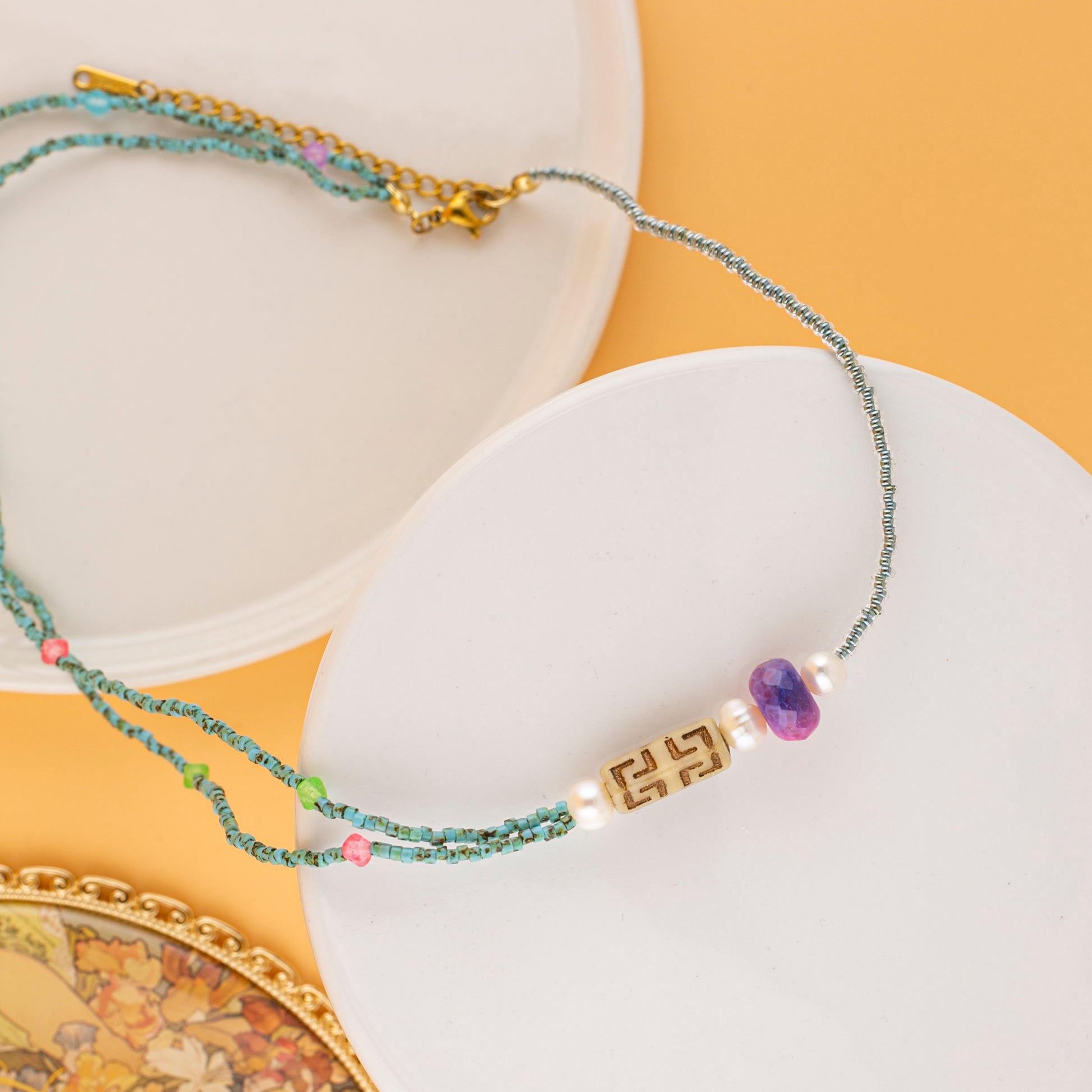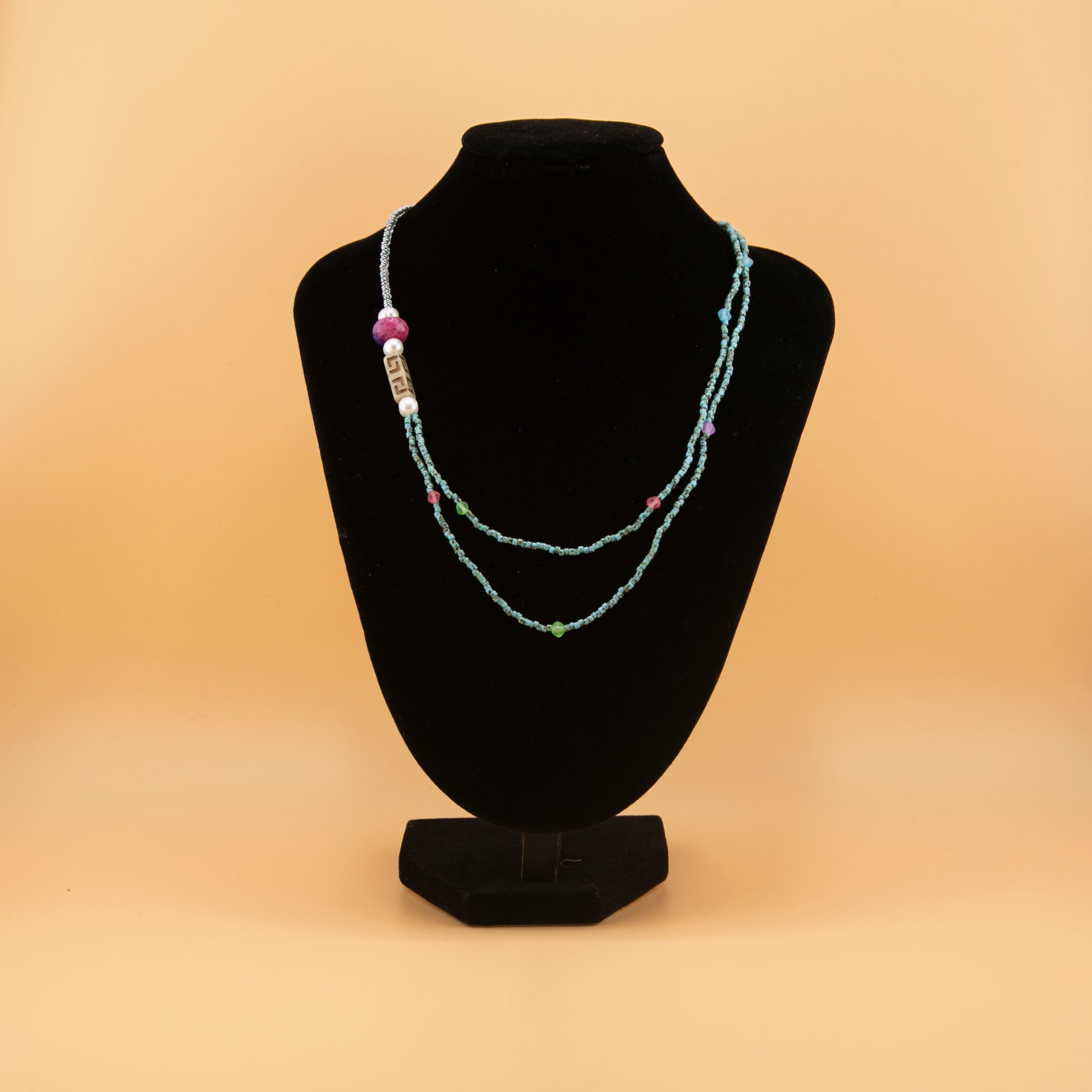 Inspired by harmony and heritage, the Tranquil Layers Necklace features delicate turquoise-hued glass beads in a double-strand design. A carved geometric bead sits alongside a bold magenta stone and pearlescent accents, adding a touch of mystique and structure to this soothing statement piece. Perfect for layering or wearing solo, this necklace brings a calm yet confident energy to any outfit.