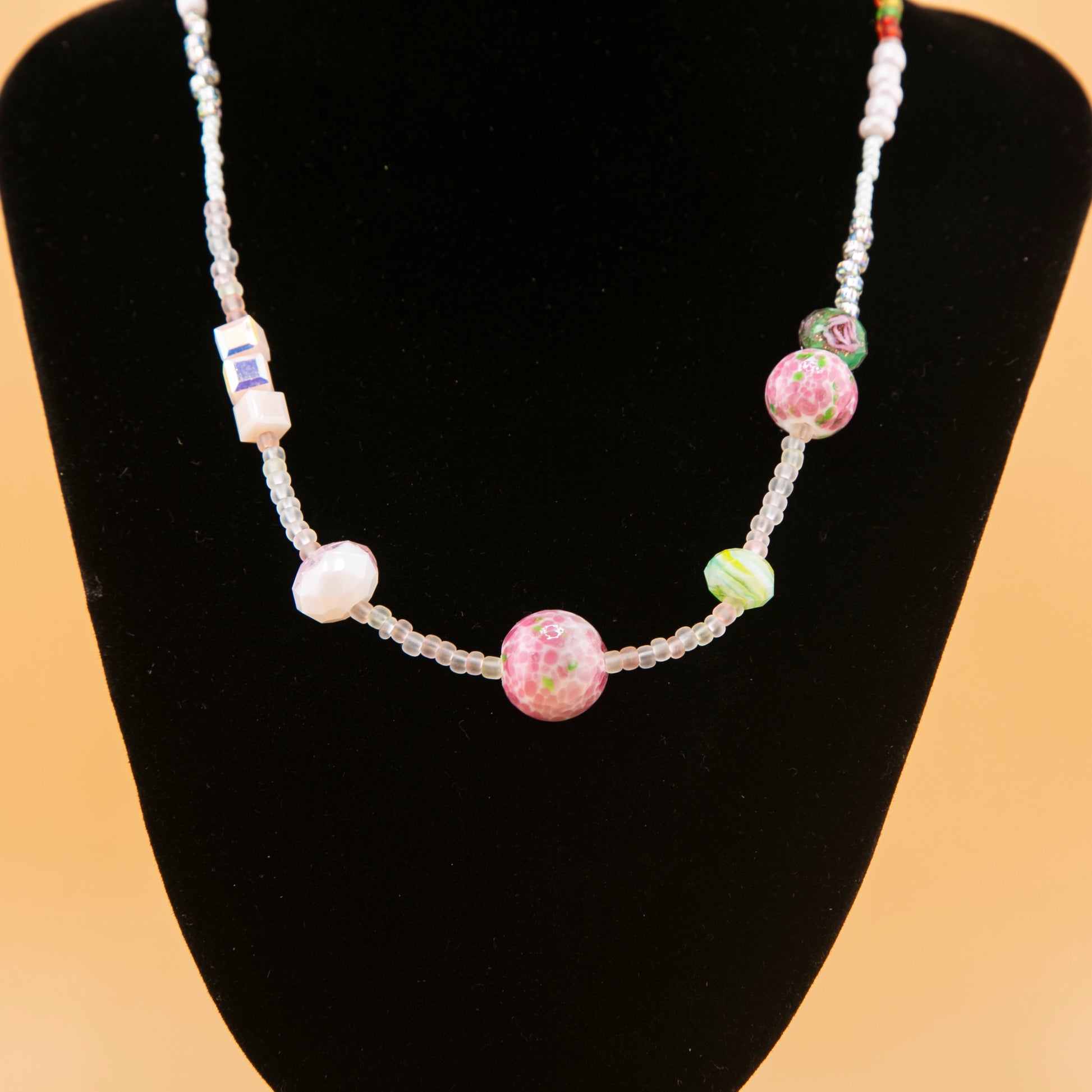 Add a touch of warmth and whimsy to your look with the Amber Petal necklace — a delicate piece handcrafted with soft pastel seed beads and accented by a striking pink-and-gold ceramic centerpiece. A translucent amber glass bead adds a nostalgic glow, evoking sunshine through flower petals. Perfect for layering or wearing solo, this one-of-a-kind necklace brings a subtle yet charming statement to any outfit.