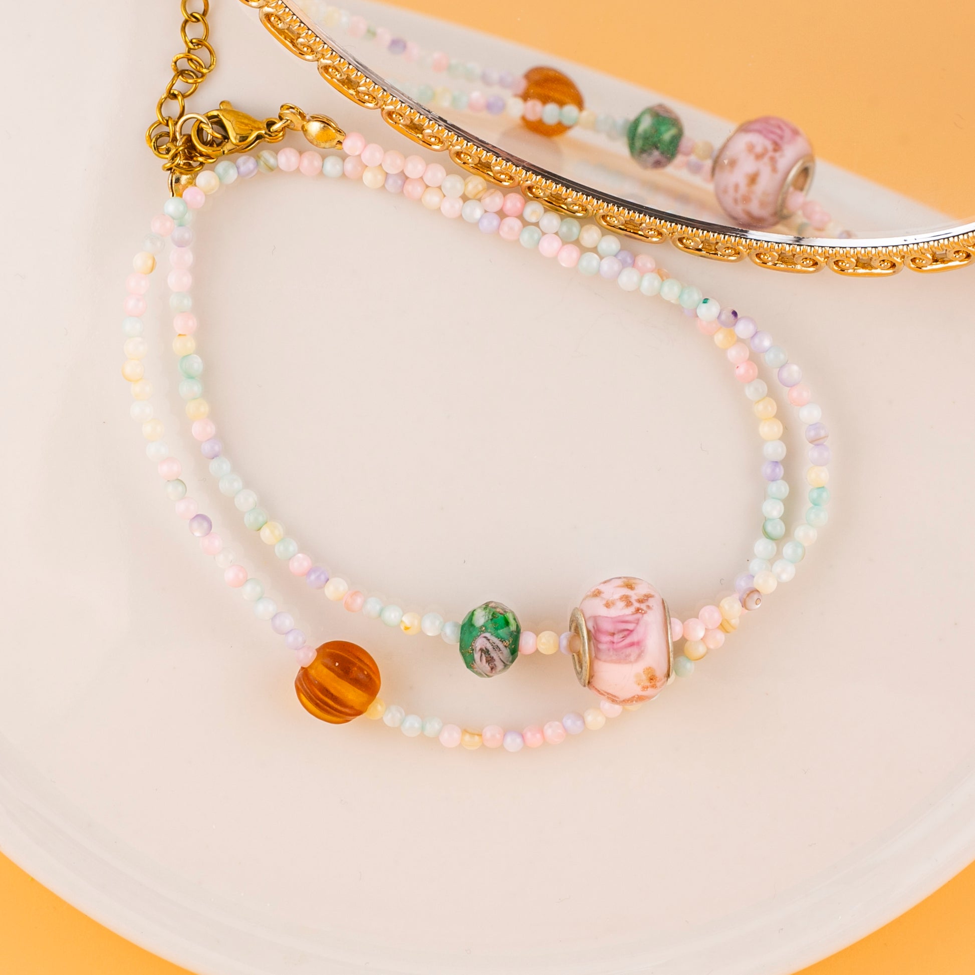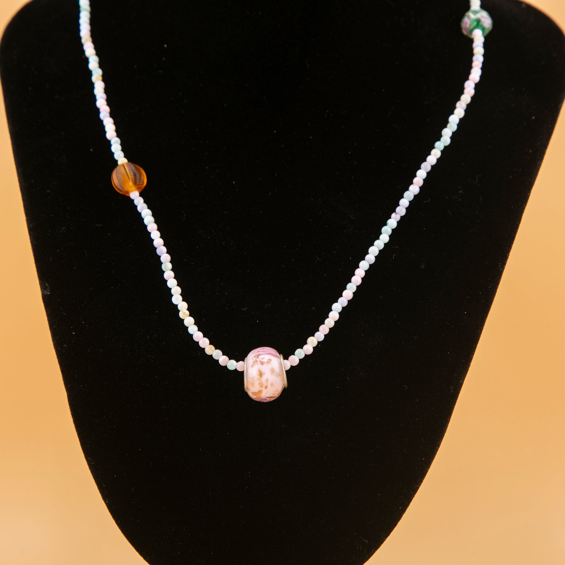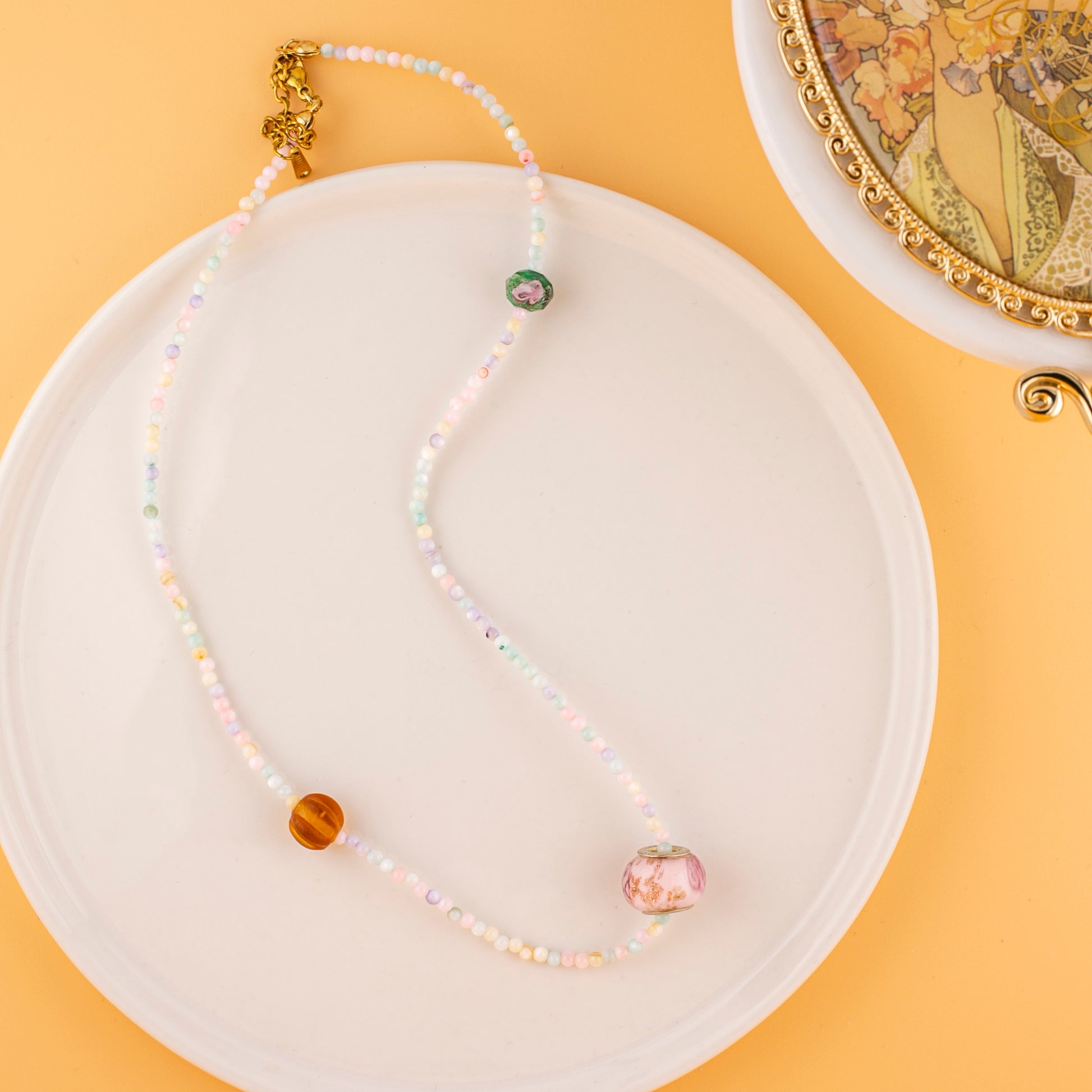 Soft, serene, and subtly playful — the Pastel Drift Necklace is a gentle celebration of color and calm. It features a strand of dreamy pastel-toned beads with a unique marbled focal bead in rose and cream, flanked by amber and jade-green accents for just a hint of contrast. Lightweight and effortlessly charming, it’s the perfect everyday piece for those who love elegance with a whisper of whimsy.