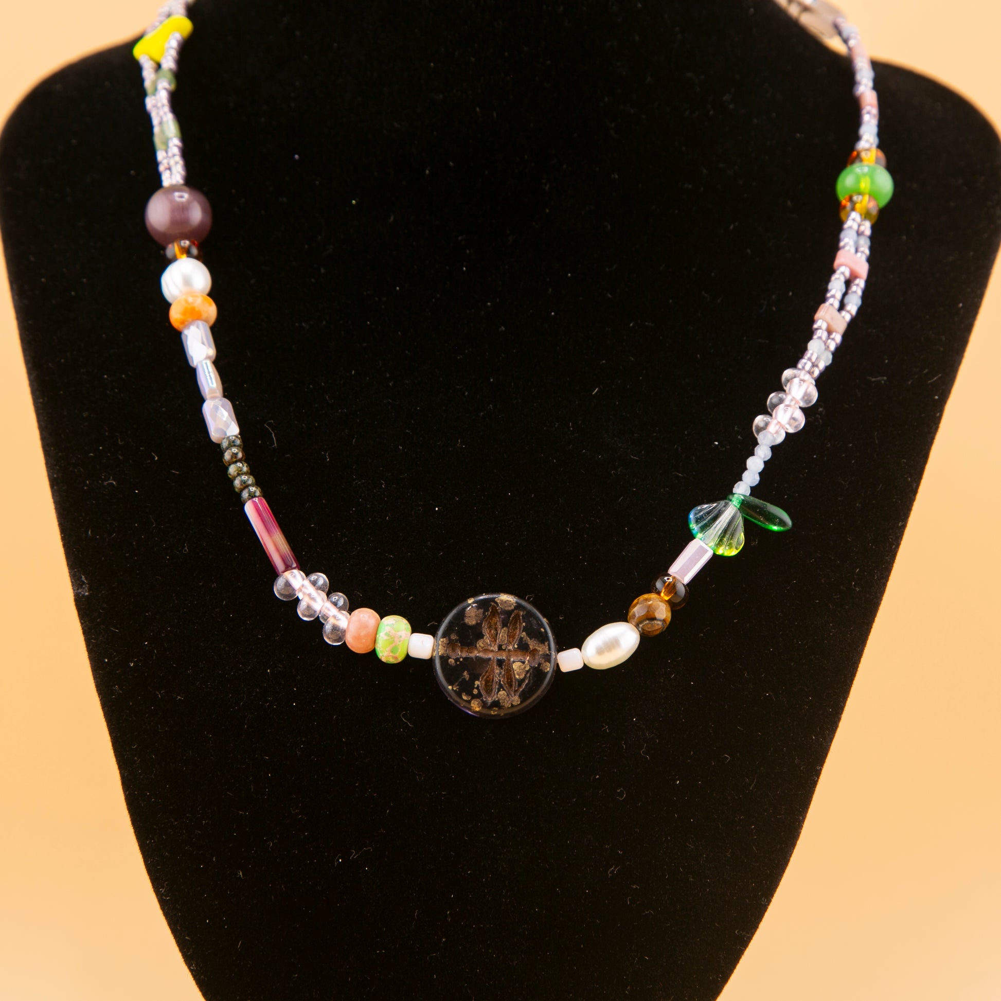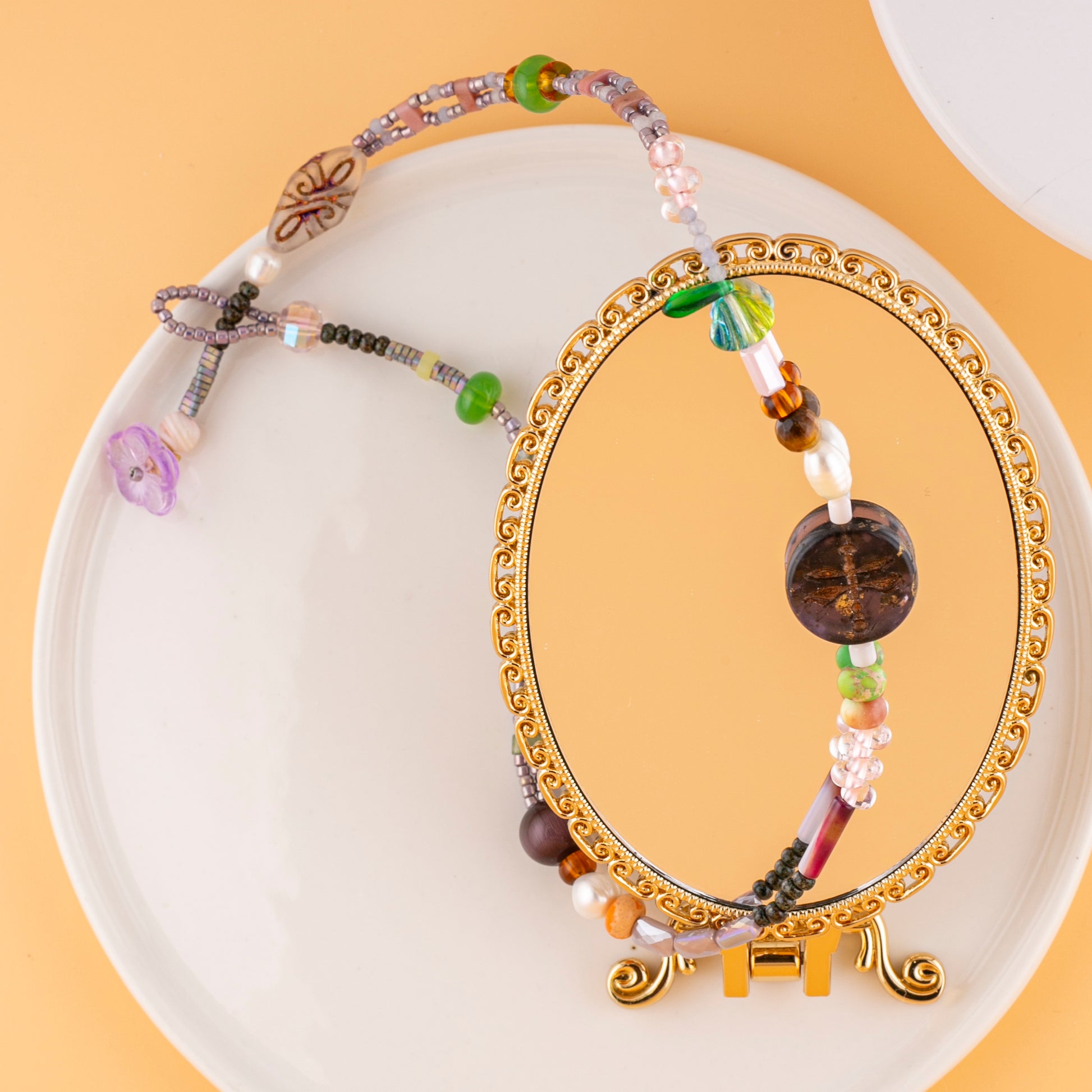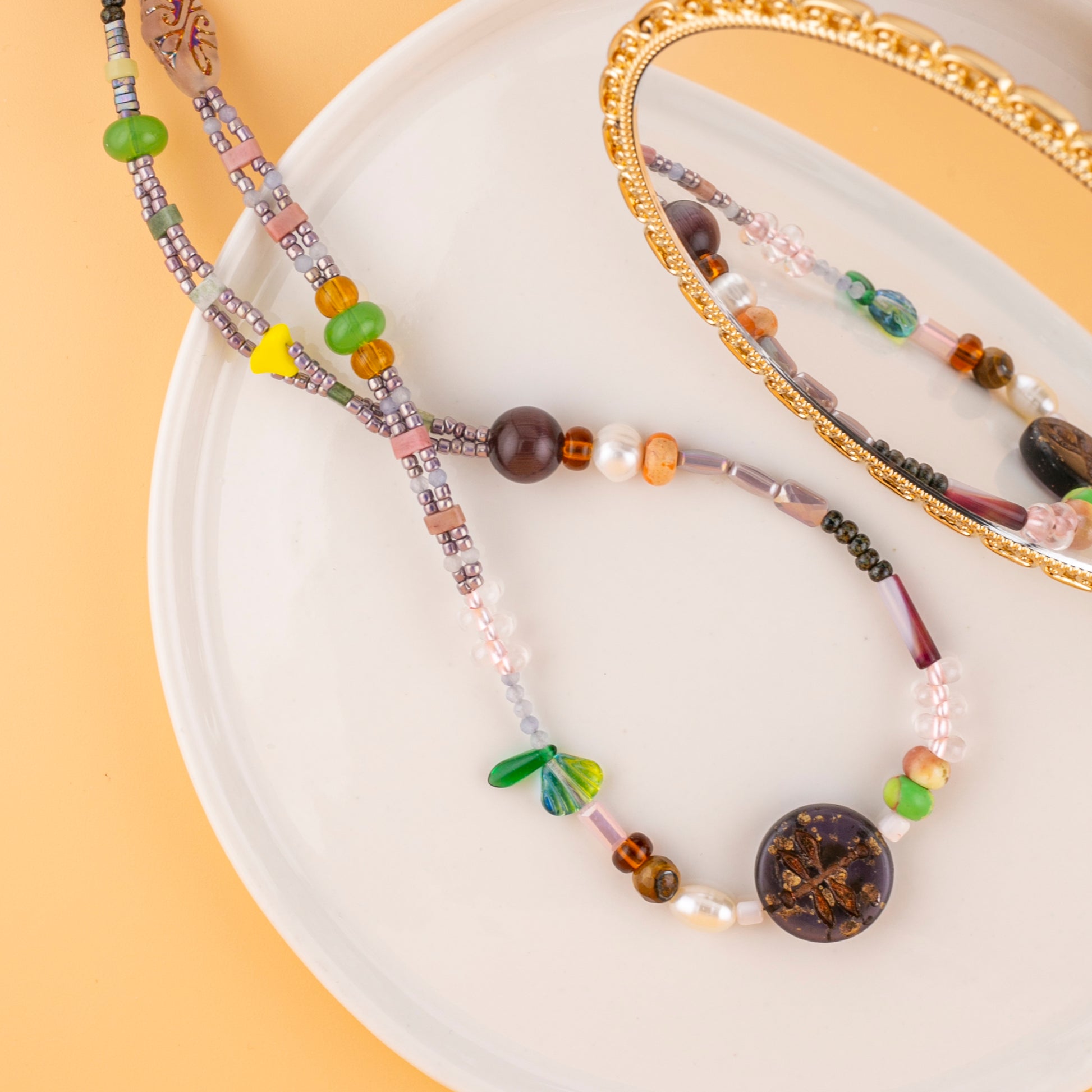 Celebrate nature’s beauty with the Botanic Whimsy Necklace, a one-of-a-kind piece that brings together eclectic charm and organic elegance. At the heart lies a round resin pendant encasing delicate botanical elements, surrounded by a vibrant medley of glass, ceramic, and pearl-like beads in earthy and playful tones. With every bead telling its own story, this necklace is a wearable garden of color and texture—perfect for free spirits and nature lovers alike.