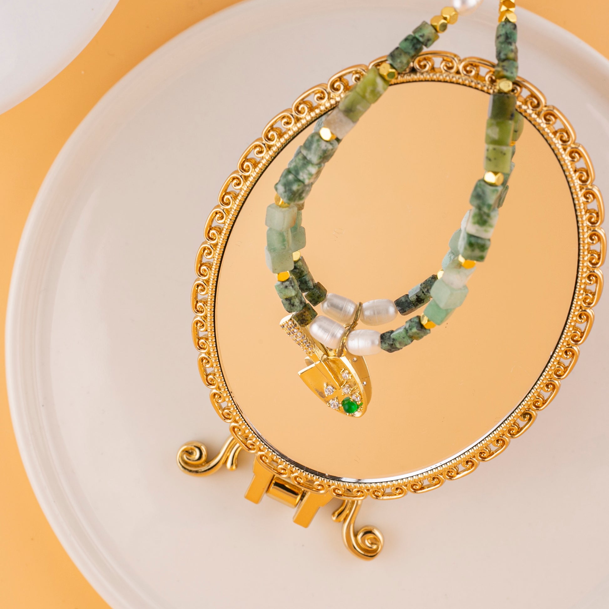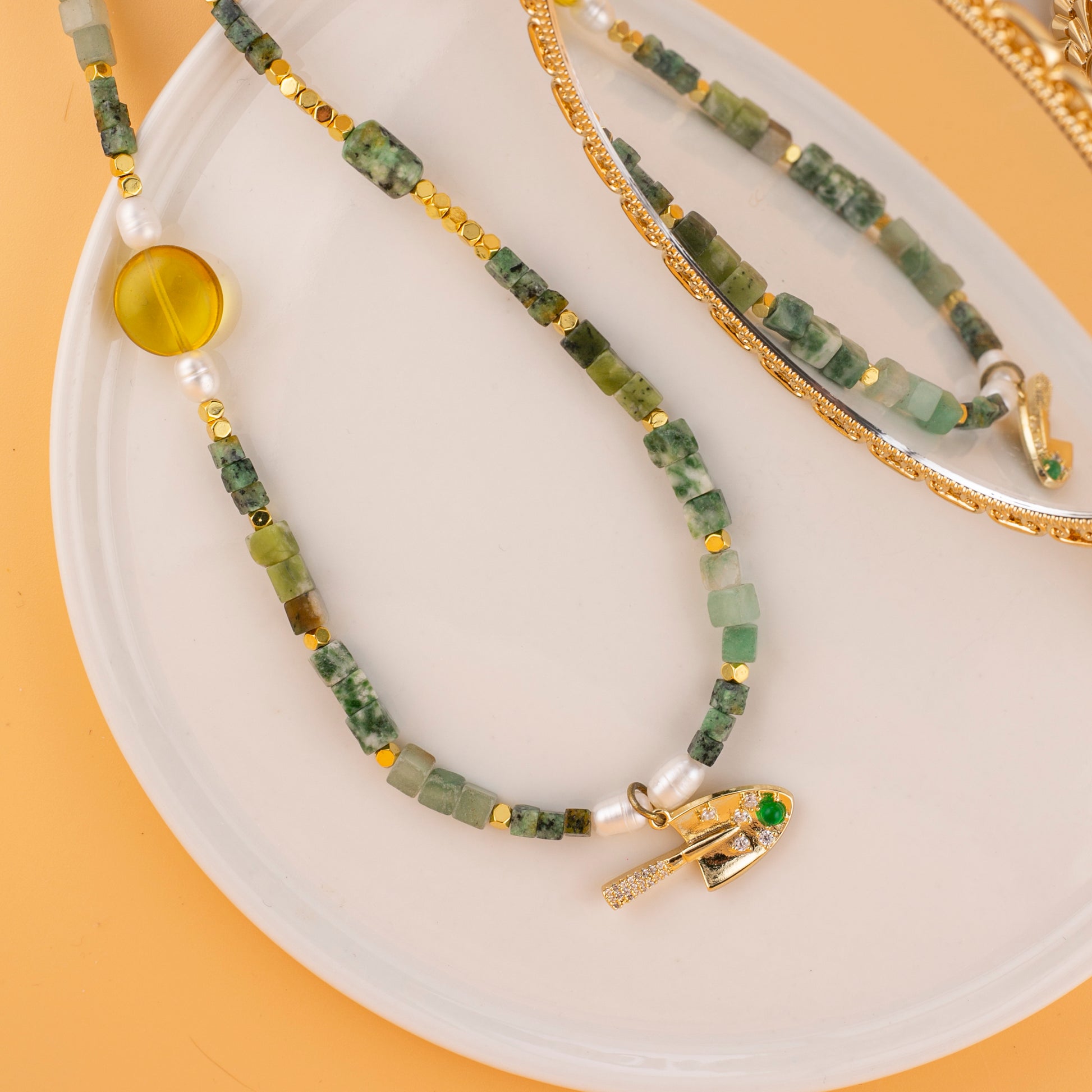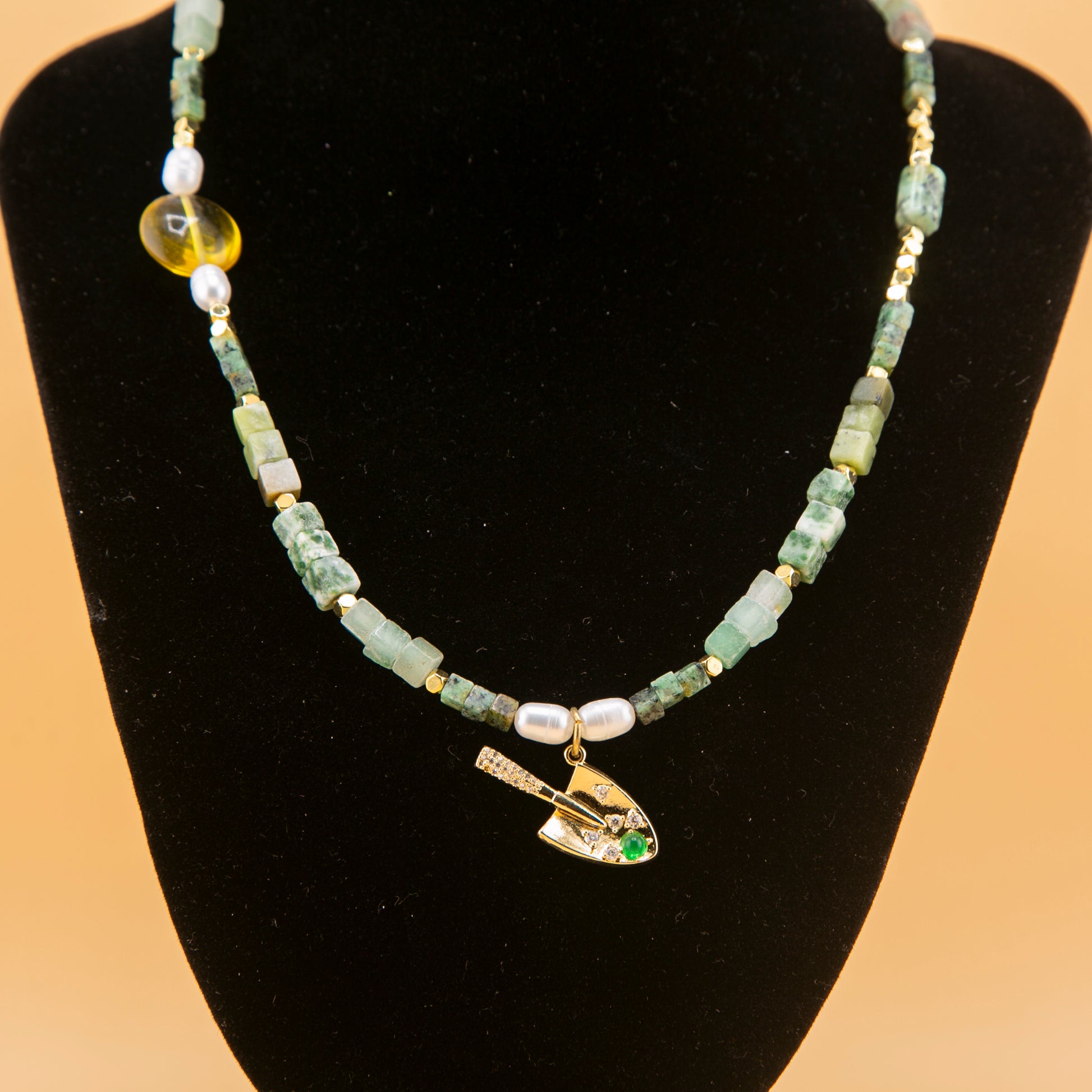 Earthy elegance meets modern charm in the Jade Spade Necklace. Hand-strung with natural green stone beads, luminous freshwater pearls, and gold-tone accents, this piece features a signature spade-shaped pendant adorned with sparkling crystals and a touch of emerald green. It’s a grounded yet eye-catching design — perfect for those who love nature-inspired jewelry with a bold twist.