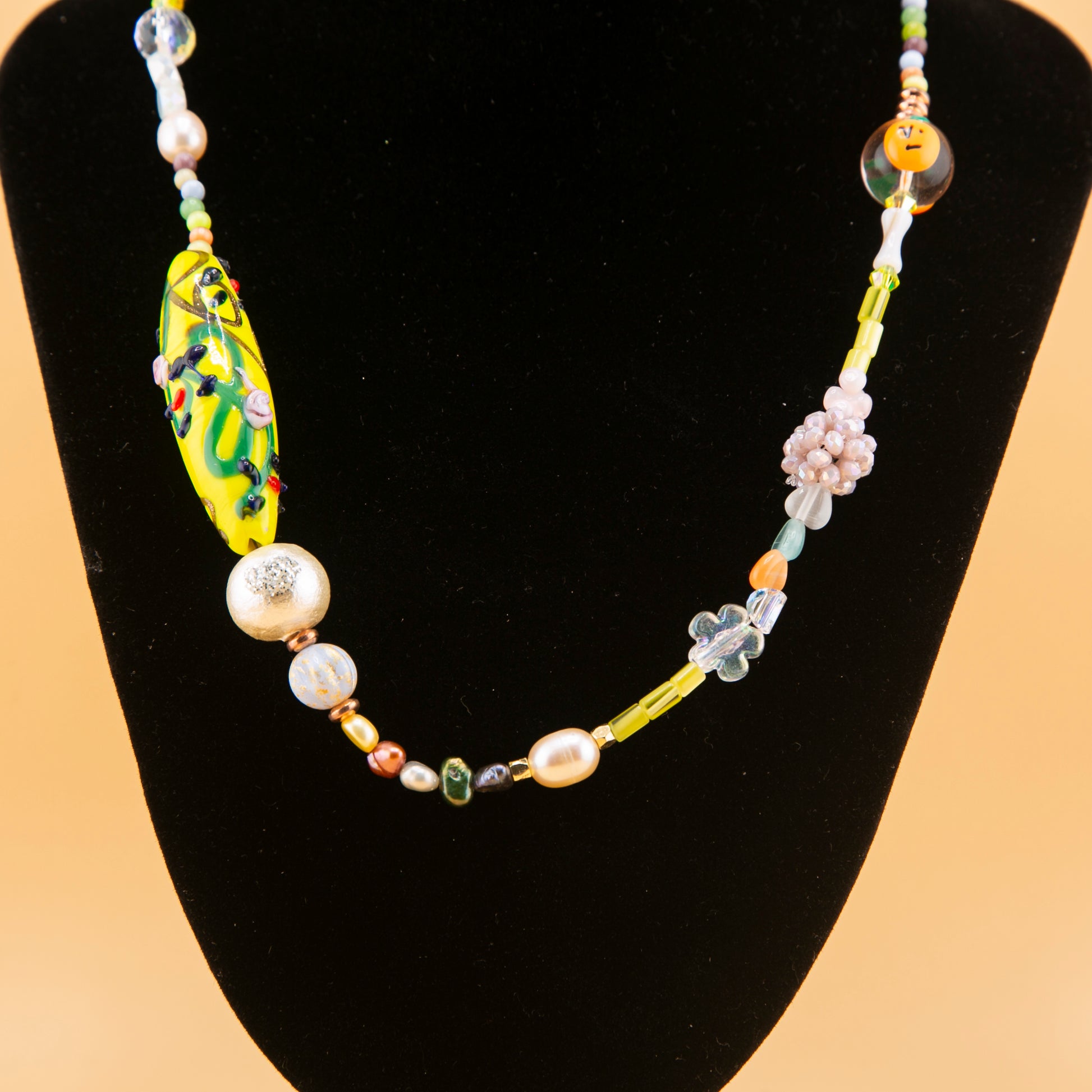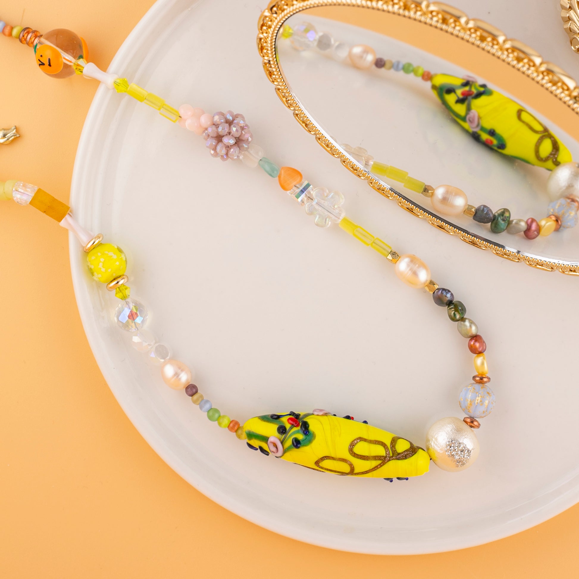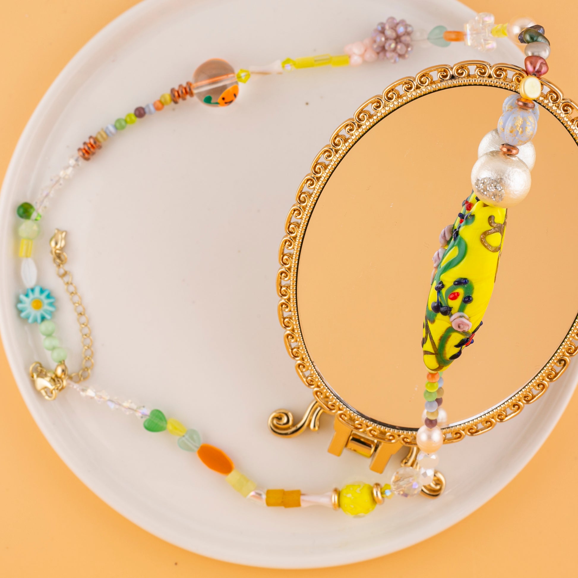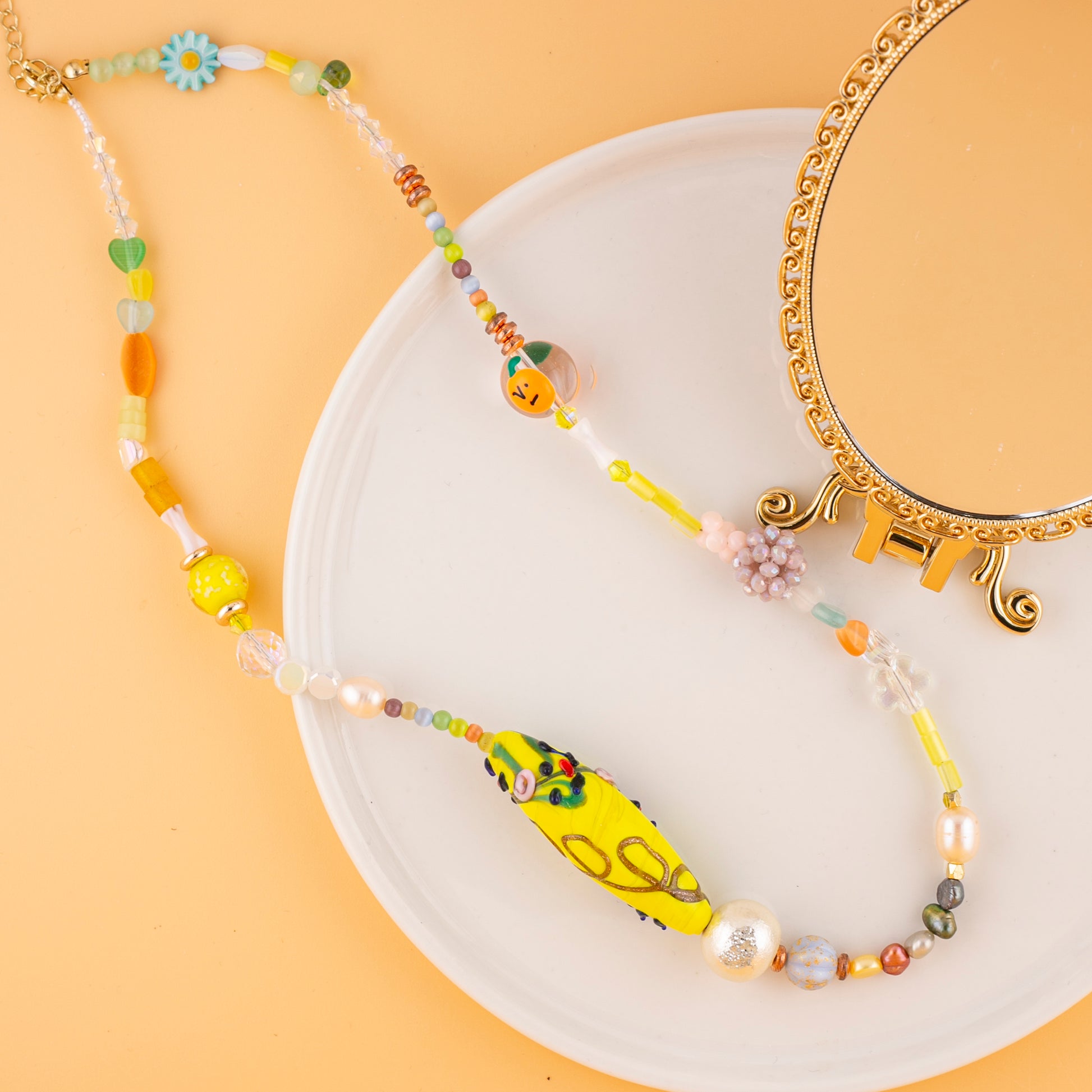 Bursting with cheerful charm, Garden Giggle necklace is a playful collage of hand-selected beads — from a bold, swirling yellow focal bead to delicate pearls, fruit-shaped accents, and even a tiny glass bear. Each bead tells its own story, creating a one-of-a-kind accessory that celebrates individuality and creativity. Wear it as your daily dose of sunshine or a conversation-starter at your next gathering.
