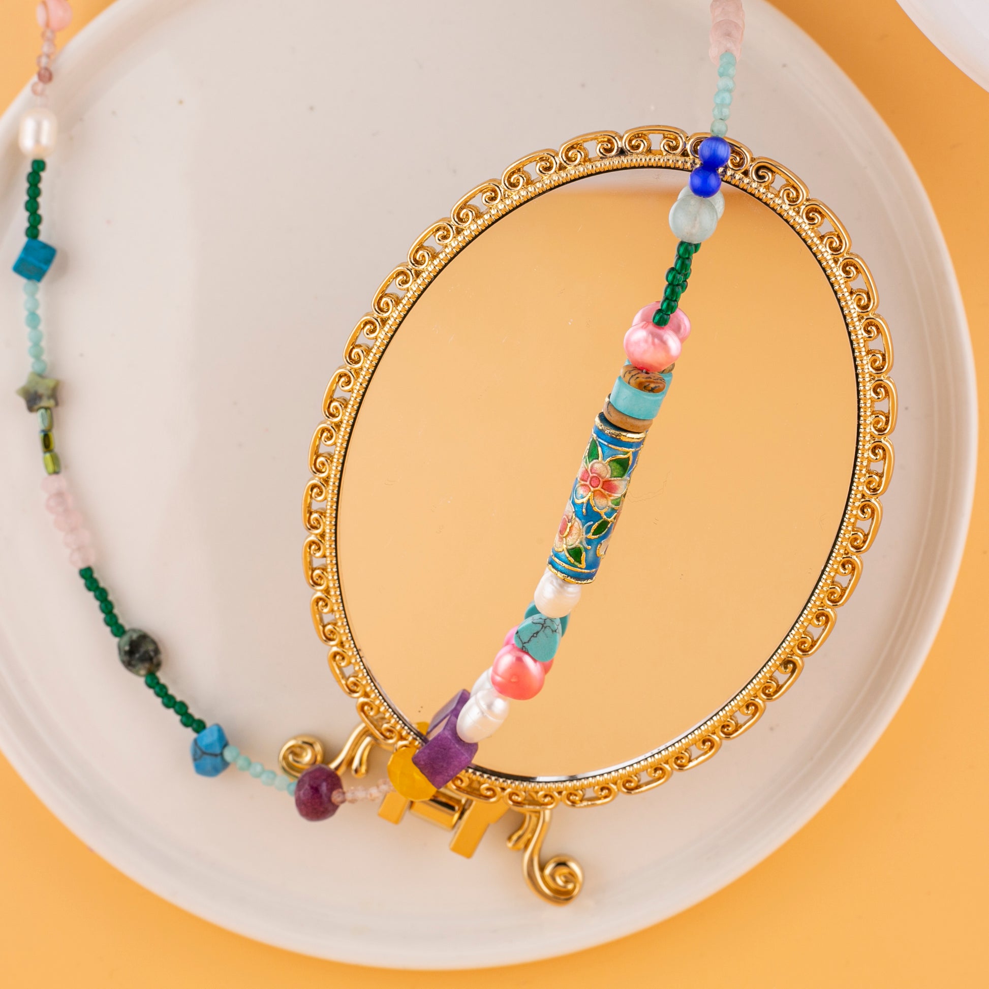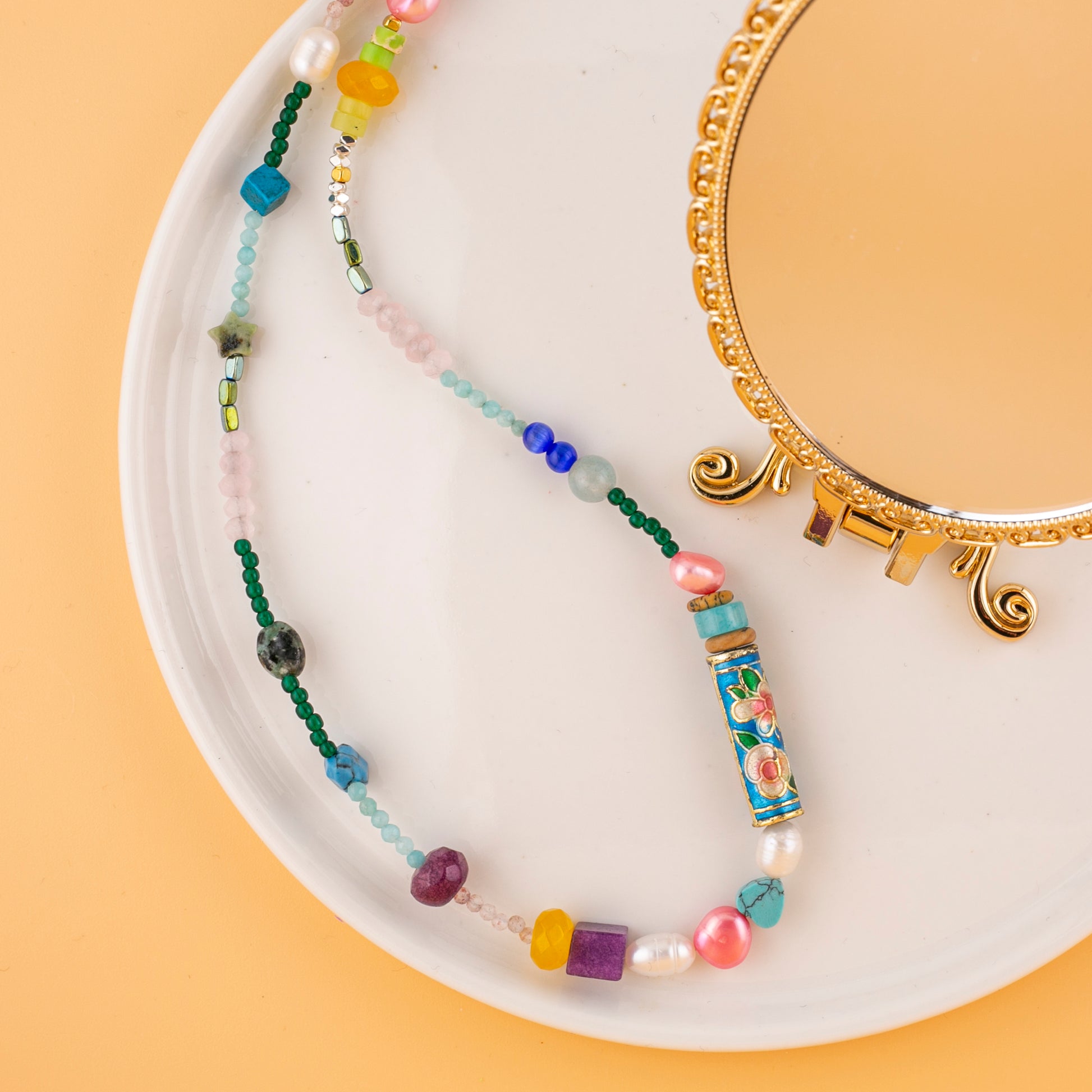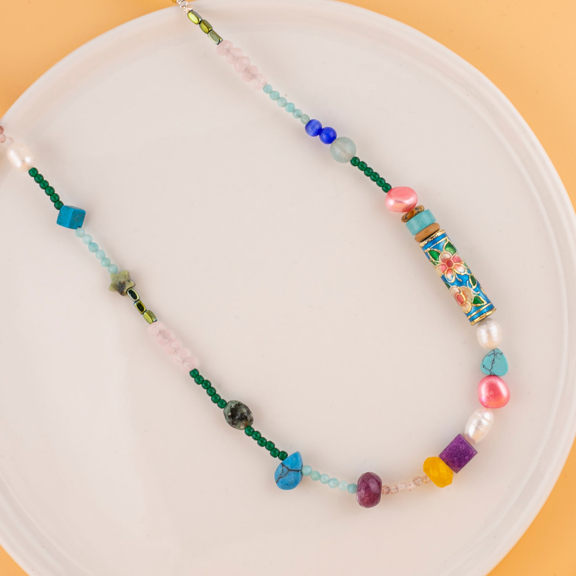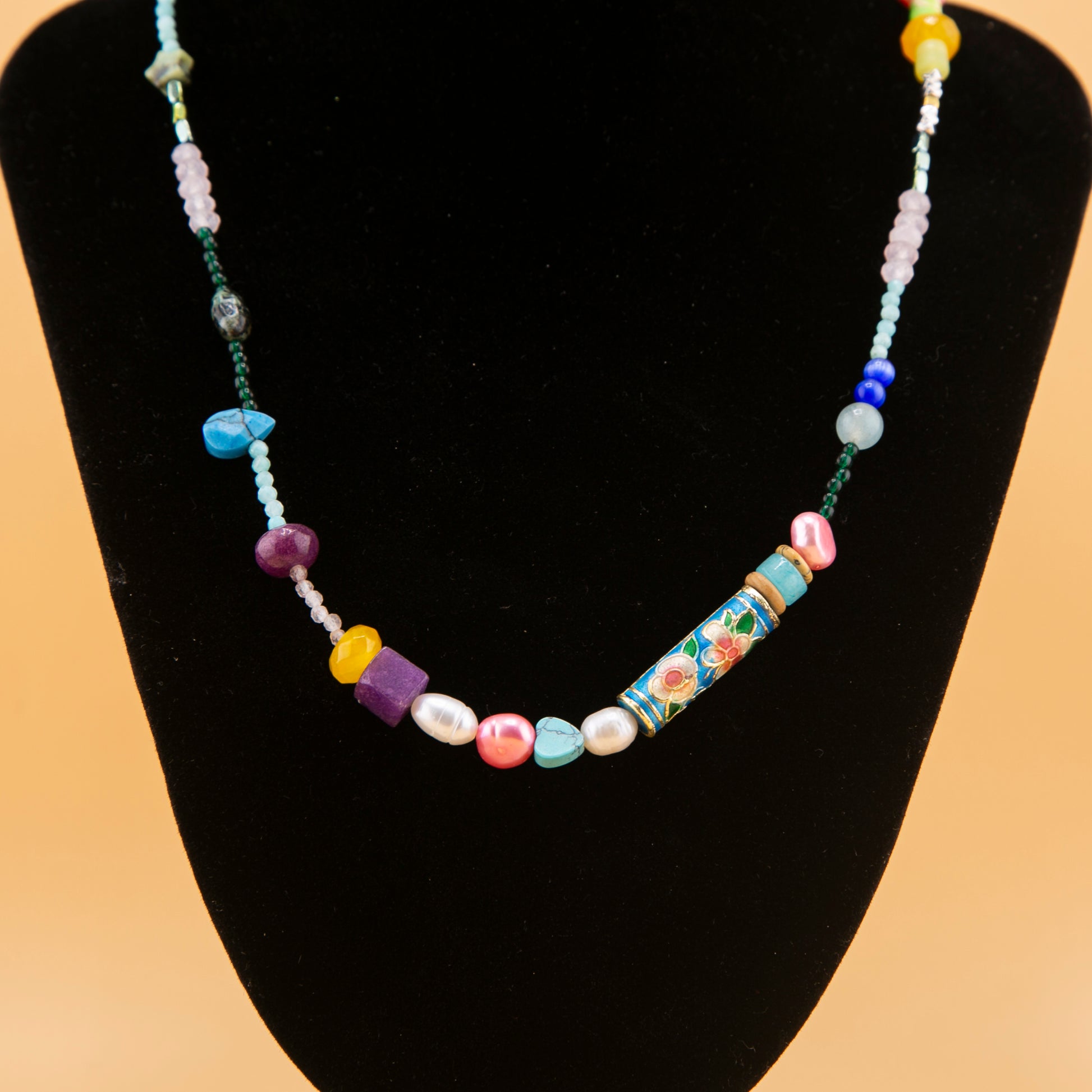 Celebrate color, culture, and craftsmanship with Garden Mosaic, a joyful handcrafted necklace featuring an array of semi-precious stones, pearls, and a stunning hand-painted cloisonné floral bead as its centerpiece. Each bead is carefully selected for its texture and tone — from deep amethyst to sky-blue turquoise — creating a wearable mosaic of natural beauty and artistic flair. No two pieces are exactly alike, making this necklace a true collector’s gem.