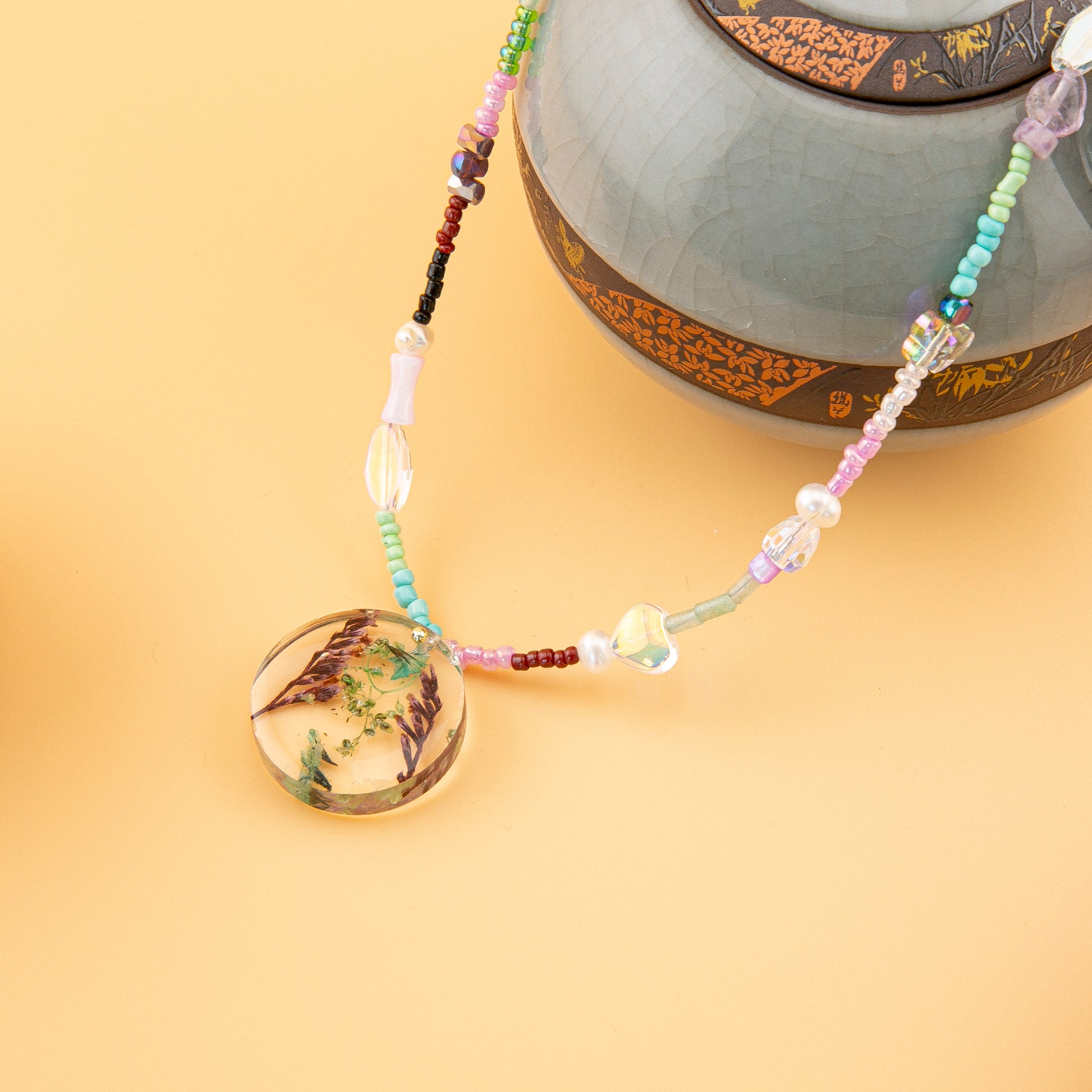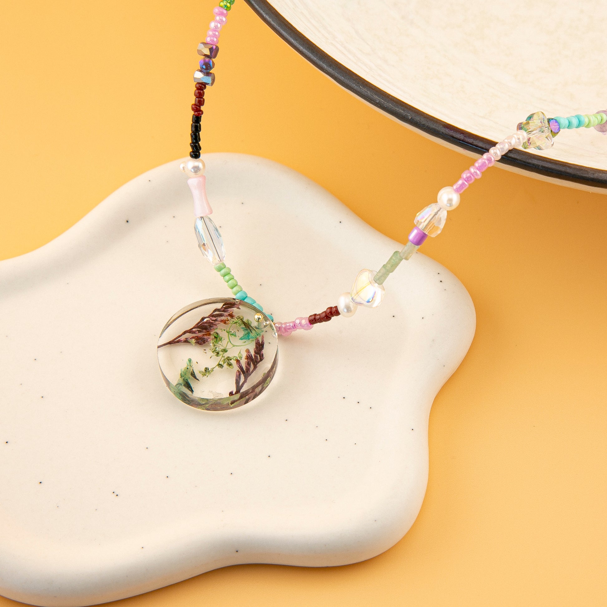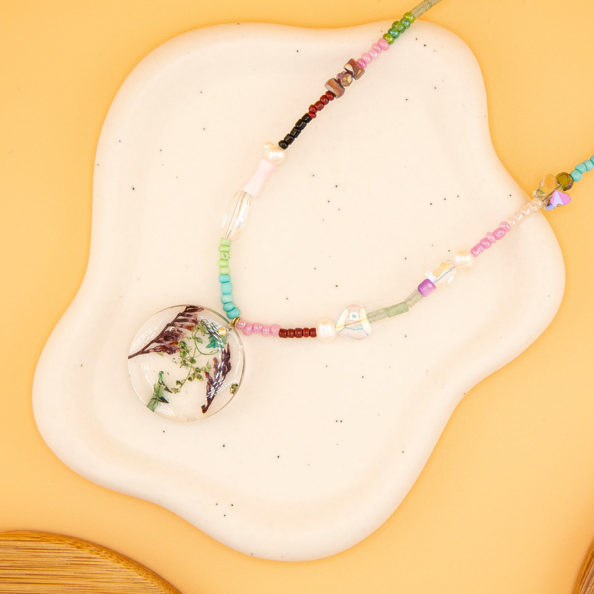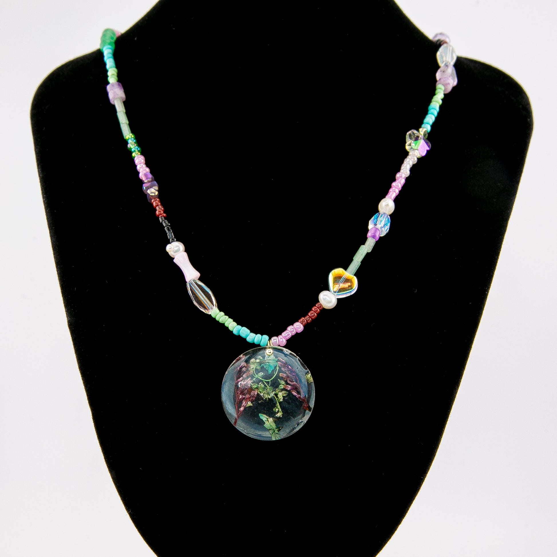 Step into a whimsical dream world with Dreamscape Bloom, a one-of-a-kind necklace featuring a mesmerizing floral pendant encased in glass-like resin. The strand bursts with color and texture, combining eclectic beads in pastel, jewel, and metallic tones — including hearts, pearls, and hand-shaped glass. This necklace celebrates individuality, creativity, and joyful expression, making it a true statement piece for free spirits.