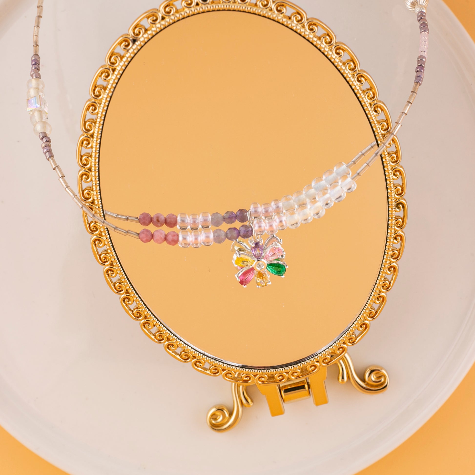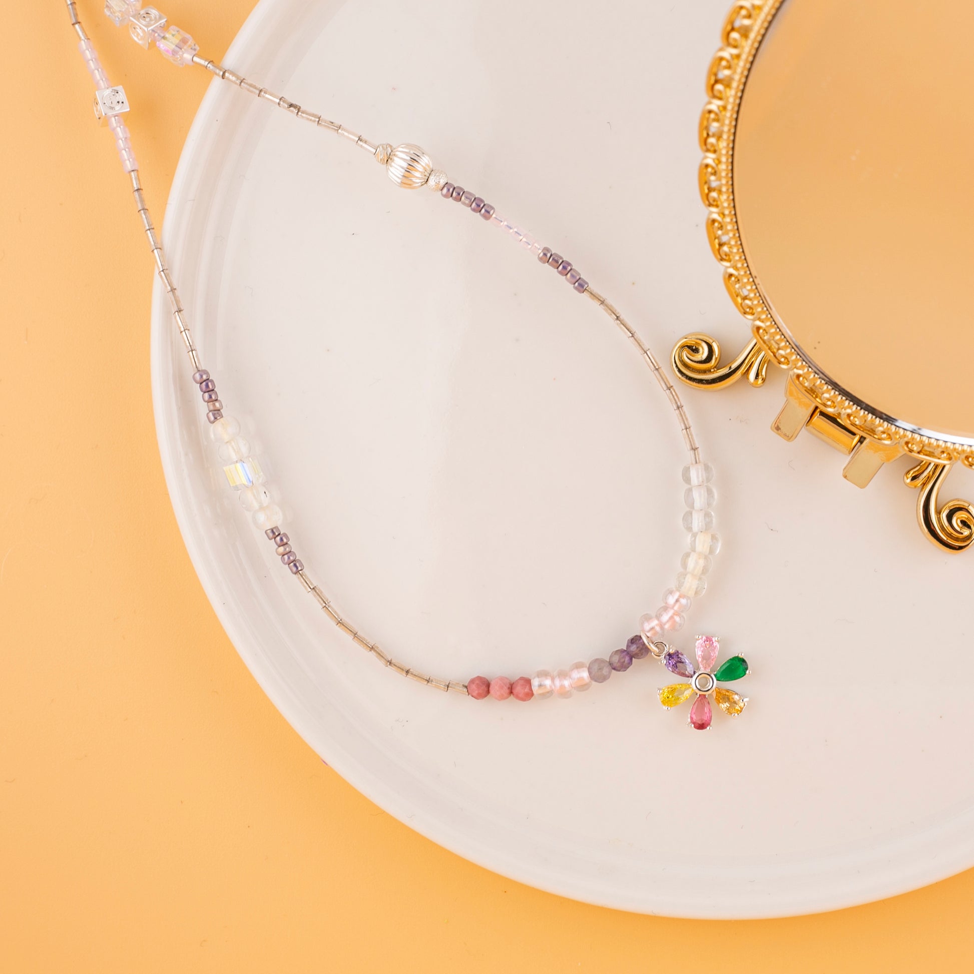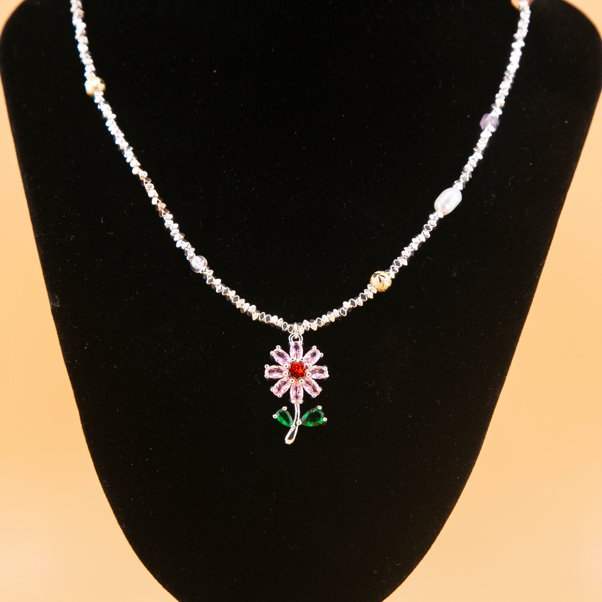 Add a burst of floral charm to your style with the Flora Spark necklace — a radiant handmade piece centered around a sparkling pink flower pendant. The chain features shimmering silver beads with pops of pearl, gold, and amethyst tones, creating a playful yet elegant contrast. With delicate green leaves at the base of the flower, this necklace brings a fresh, garden-inspired touch to your everyday look.