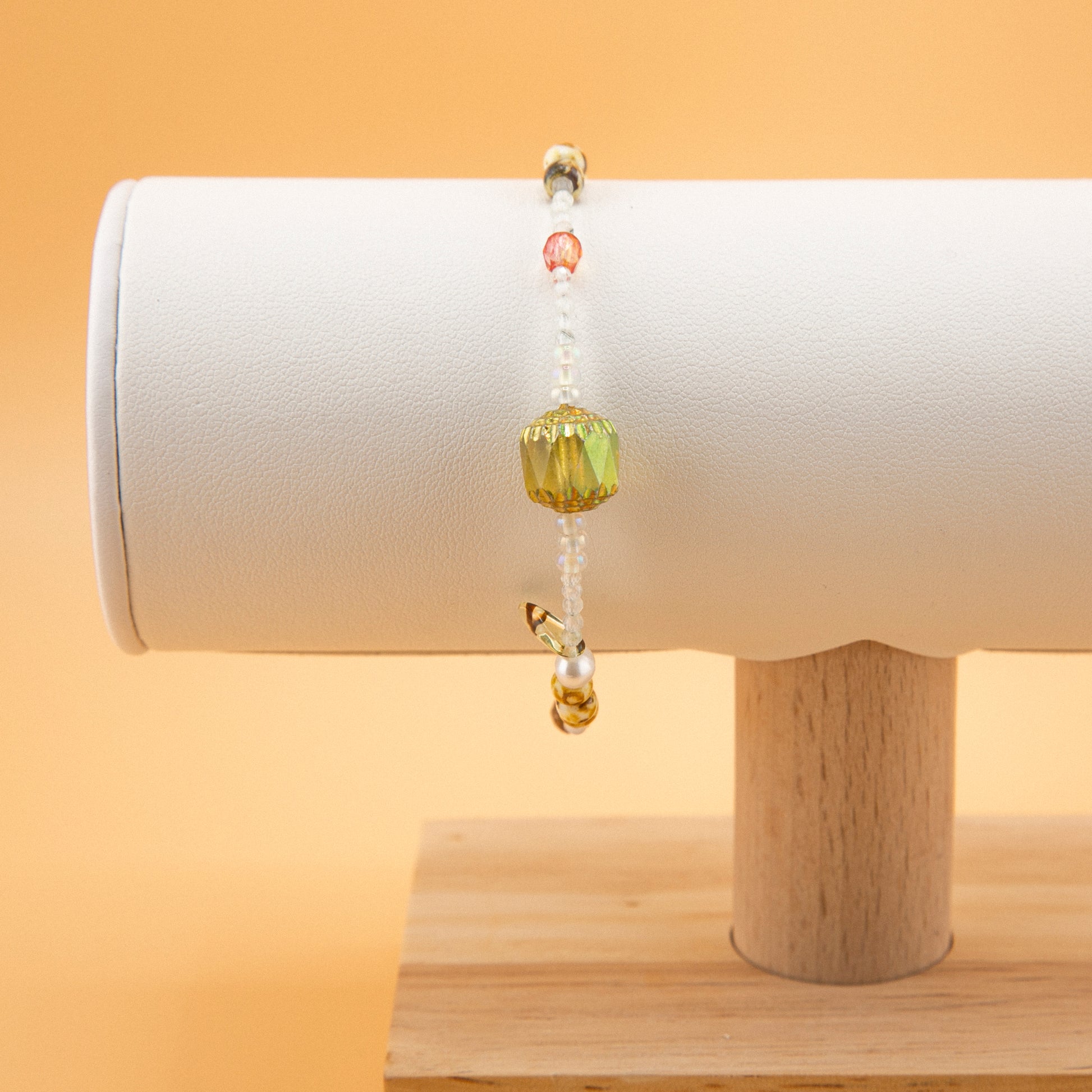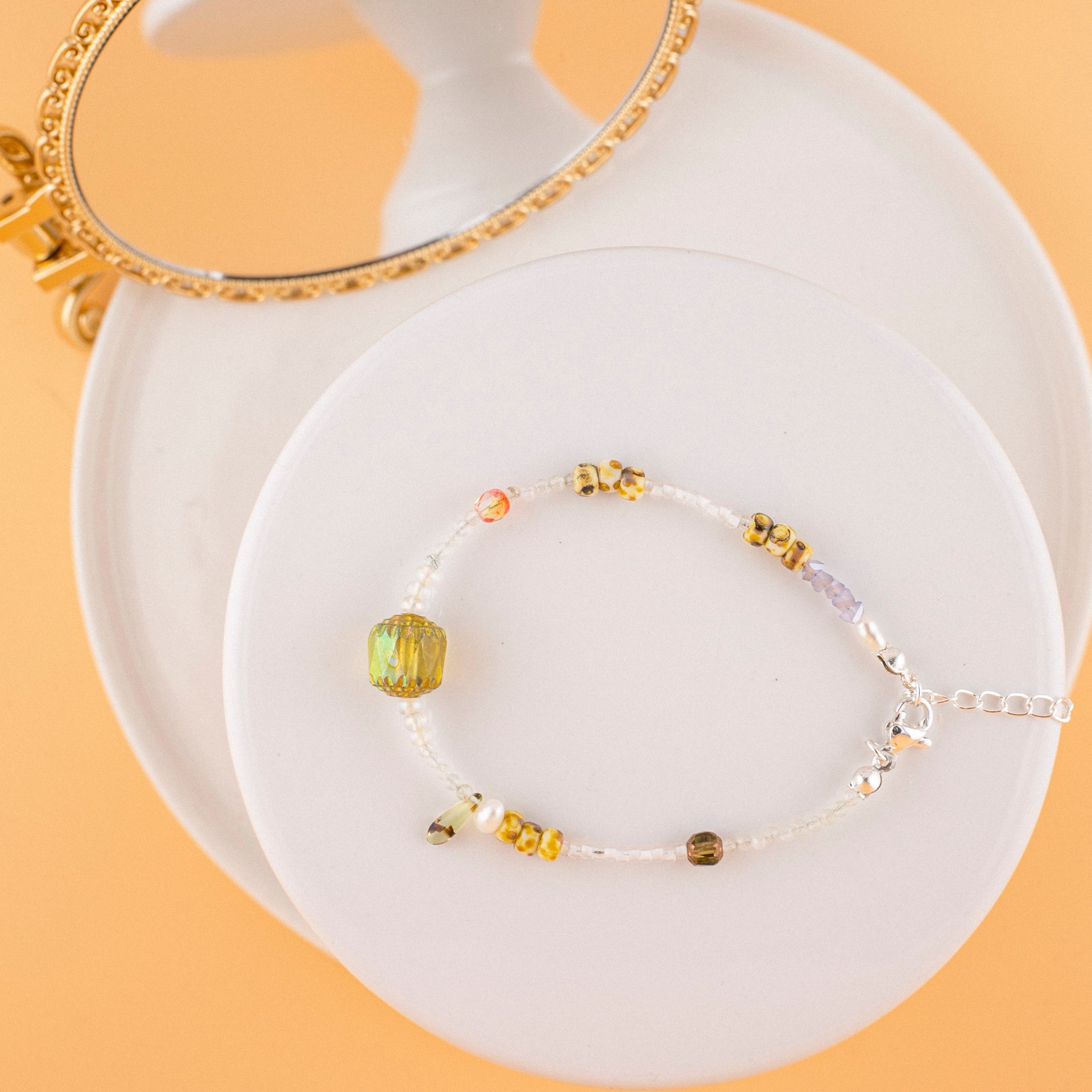 Delicate and full of charm, the Citrine Whisper Beaded Bracelet is a handmade treasure crafted with care and creativity. Featuring a luminous mix of golden yellow, soft lavender, pearly whites, and translucent glass beads, it’s centered with an iridescent green bead that catches the light like morning dew.